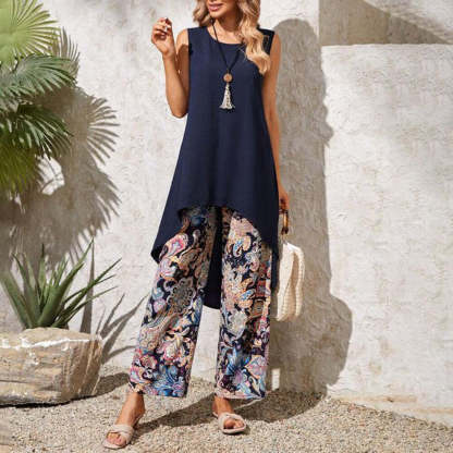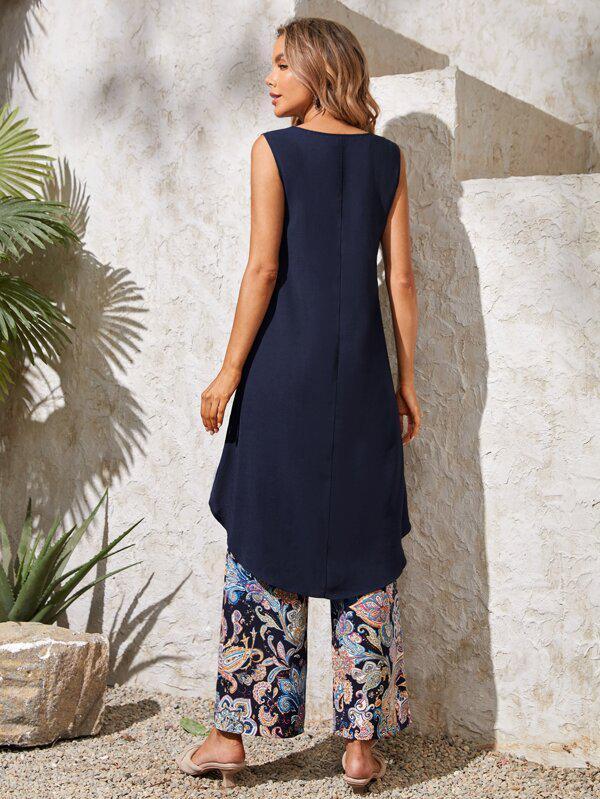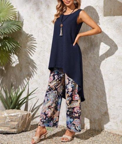 Stay stylish and cool in this Navy Print Sleeveless Two Piece Set. Made with high quality fabric, this set features a sleek navy print design and a comfortable sleeveless cut. Perfect for any occasion, this set is a must-have for any fashion-forward individual.