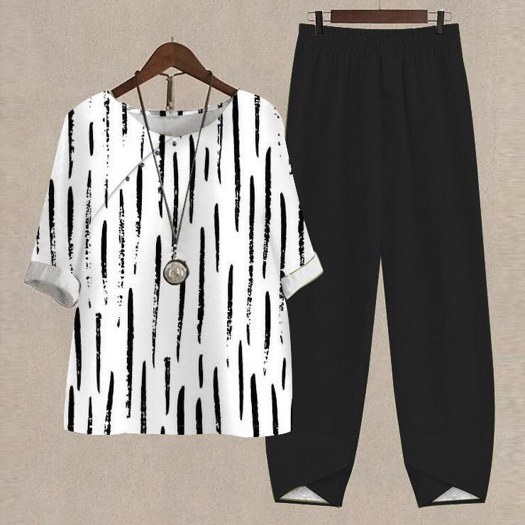 This two-piece set is perfect for your stylish wardrobe. The white top and black pants feature a hand-painted line and doodle style abstract grunge texture, giving you an effortlessly chic look. The grunge broken lines vector seamless pattern adds a touch of class to complete the ensemble.