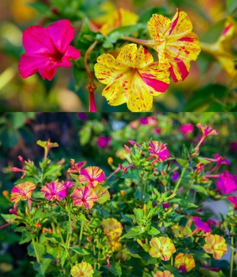 Marvel of Peru Four O' Clock is a shrub-like, erect and spreading, tuberous perennial often grown as an annual, with clusters of fragrant trumpet flowers from summer to fall. The flowers usually open from late afternoon or at dusk (namely between 4 and 8 o'clock), giving rise to one of its common names. Flowers then produce a strong, sweet-smelling fragrance throughout the night, then close for good in the morning. New flowers open the following day. Flowers are yellow, pink and white, but a different combination of flowers can grow on the same plant. It has color-changing properties, for example, as the plant matures, the yellow flowers can gradually change to a dark pink color. Similarly, white flowers can change to light violet.